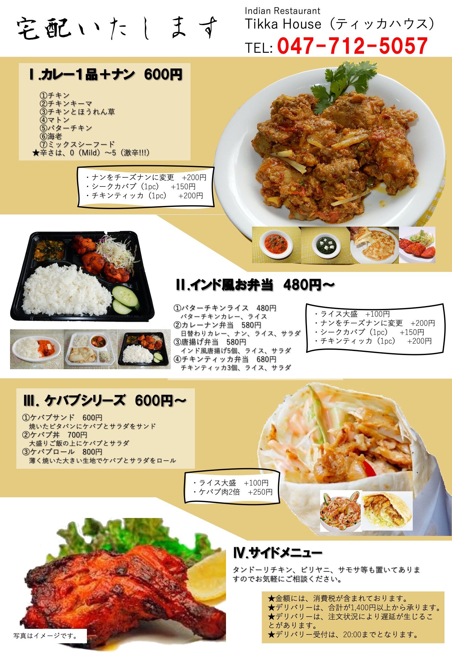 インド&パキスタン料理レストラン Tikka House(ティッカハウス) の宅配のチラシ。