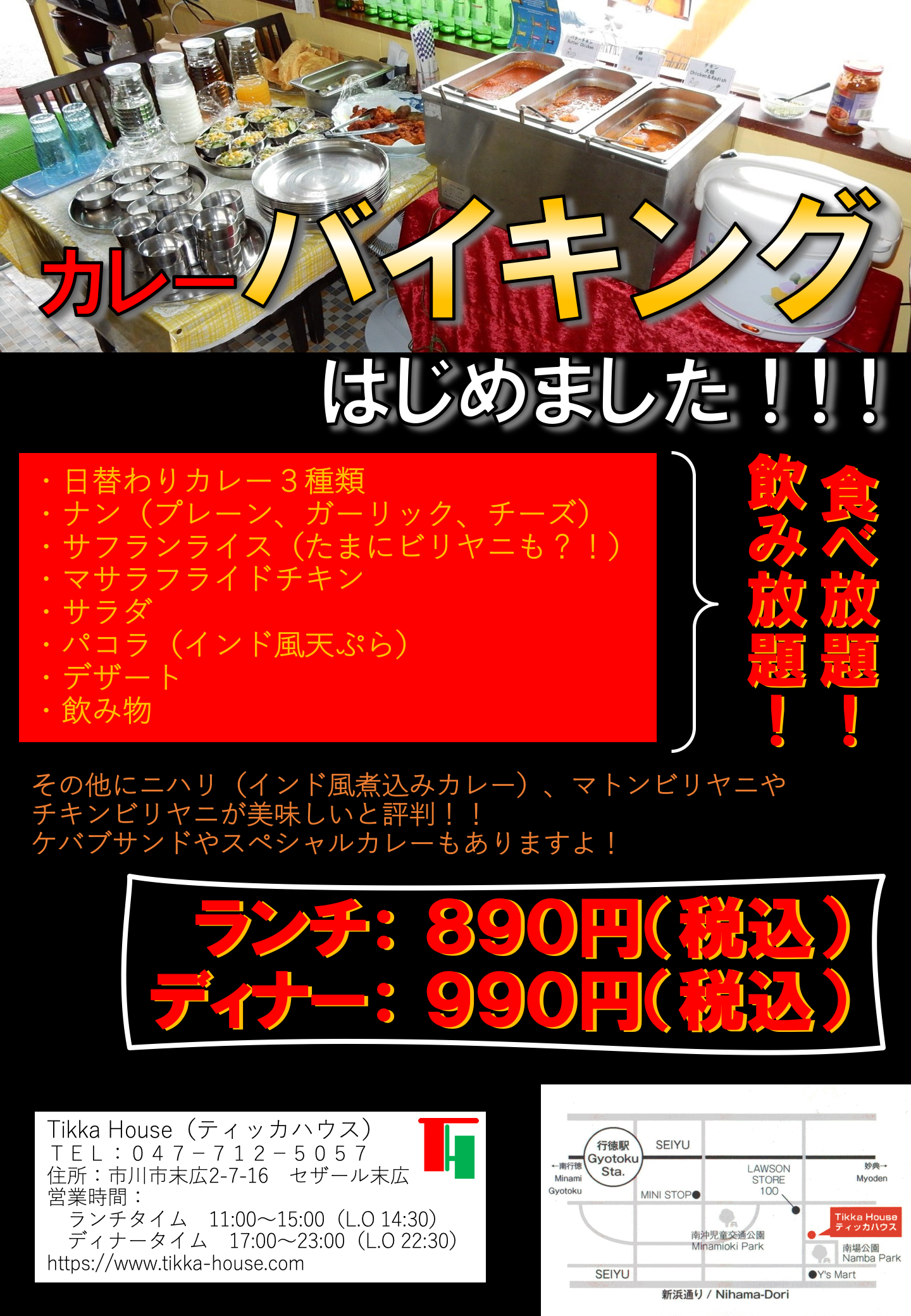 インド&パキスタン料理レストラン Tikka House(ティッカハウス) のバイキングのチラシ。