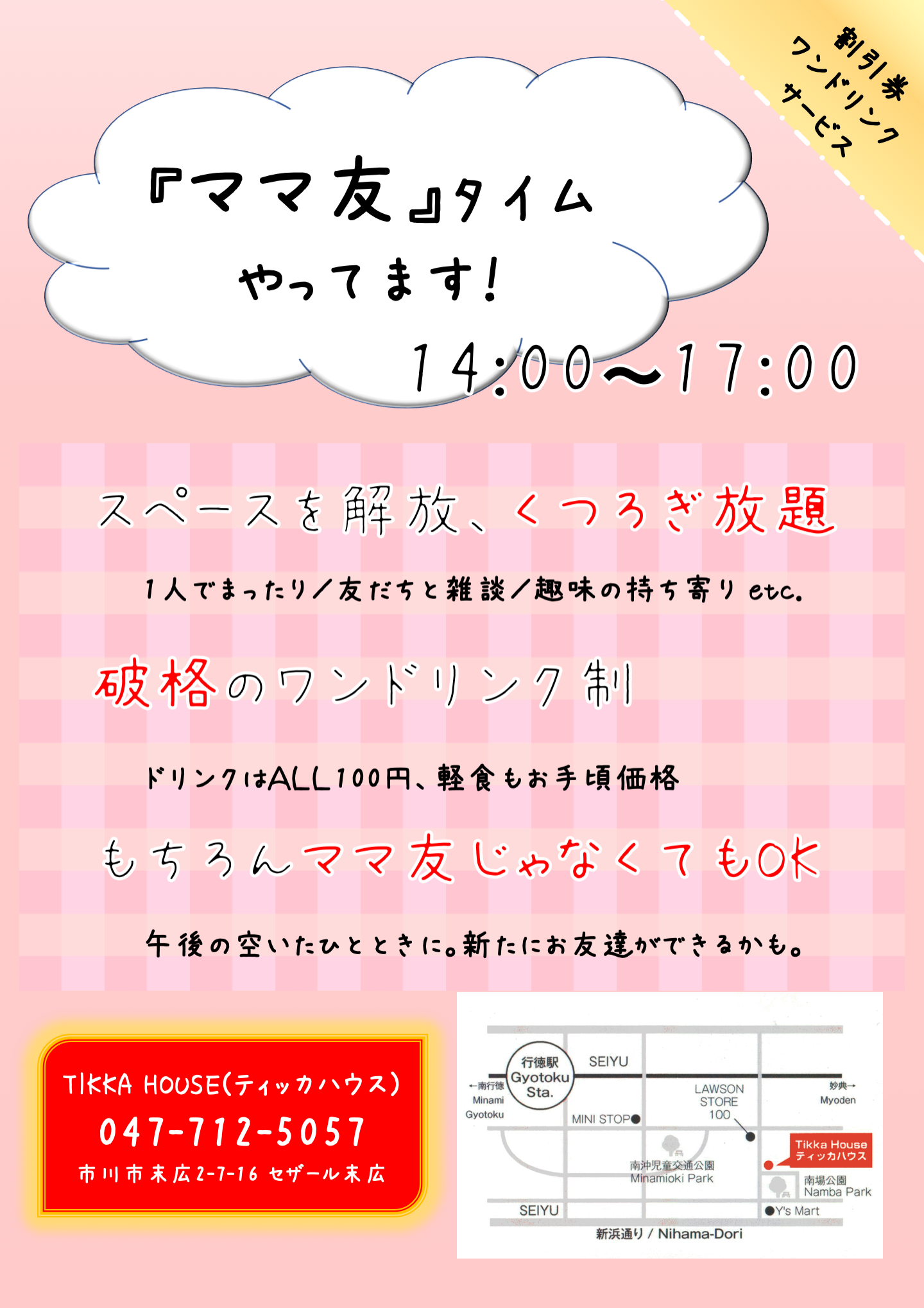 インド&パキスタン料理レストラン Tikka House(ティッカハウス) のママ友タイムのチラシ。